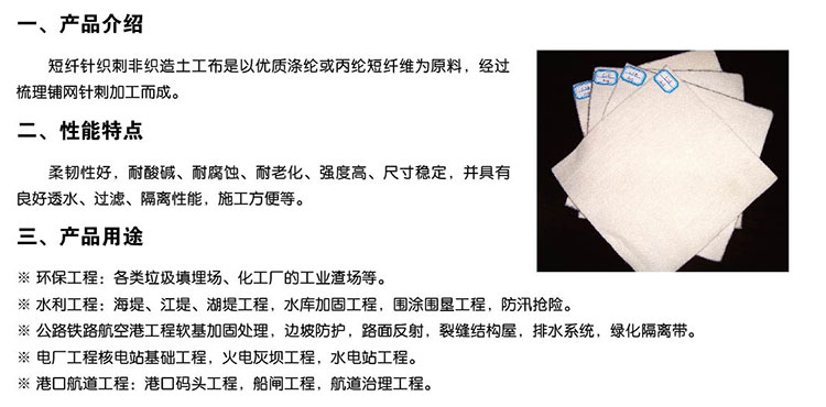 全稱: 短纖針刺土工布 規(guī)格參數(shù): 纖度為6-12旦,長度為54-64mm